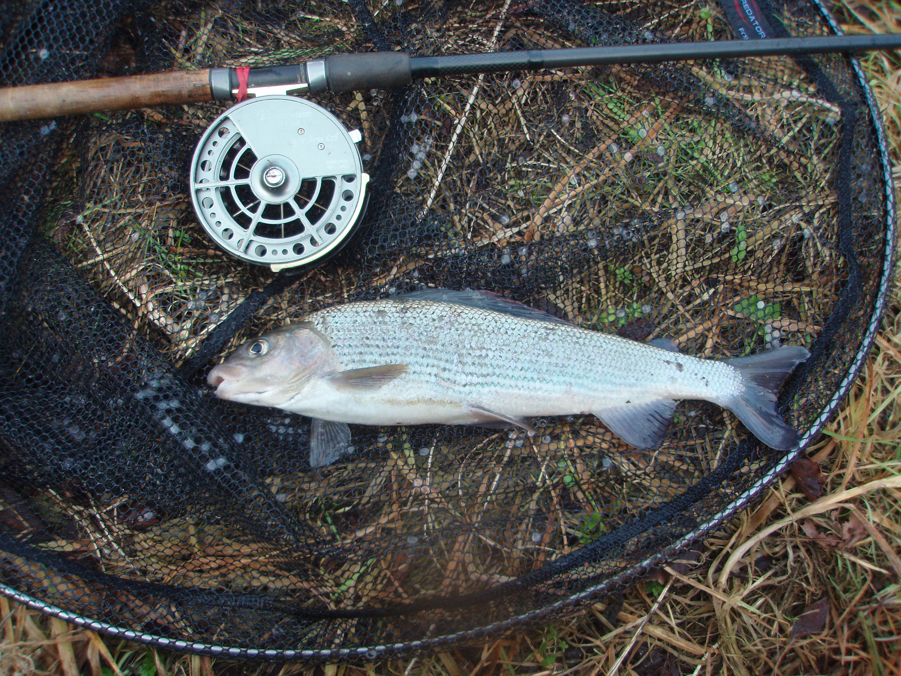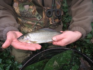 I helped Jules set-up his tackle and guided him through the basics of using a centrepin. He took to it reasonably well and more importantly enjoyed the experience. After a while, I left him to it, confident that he would soon catch. I opted to fish a run just above him. I waded out and ran the float through a nice 4′ deep run. The double maggot hook bait was soon snaffled up by a fish. It turned out to be a feisty trout and a couple more followed that one. Then the float shot under and this time a really nice grayling was the culprit. It looked about 1lb 8oz+ but I didn’t weigh it as I was wading out in the river. I followed that up with another nice grayling of about 1lb 2oz and then another trout.