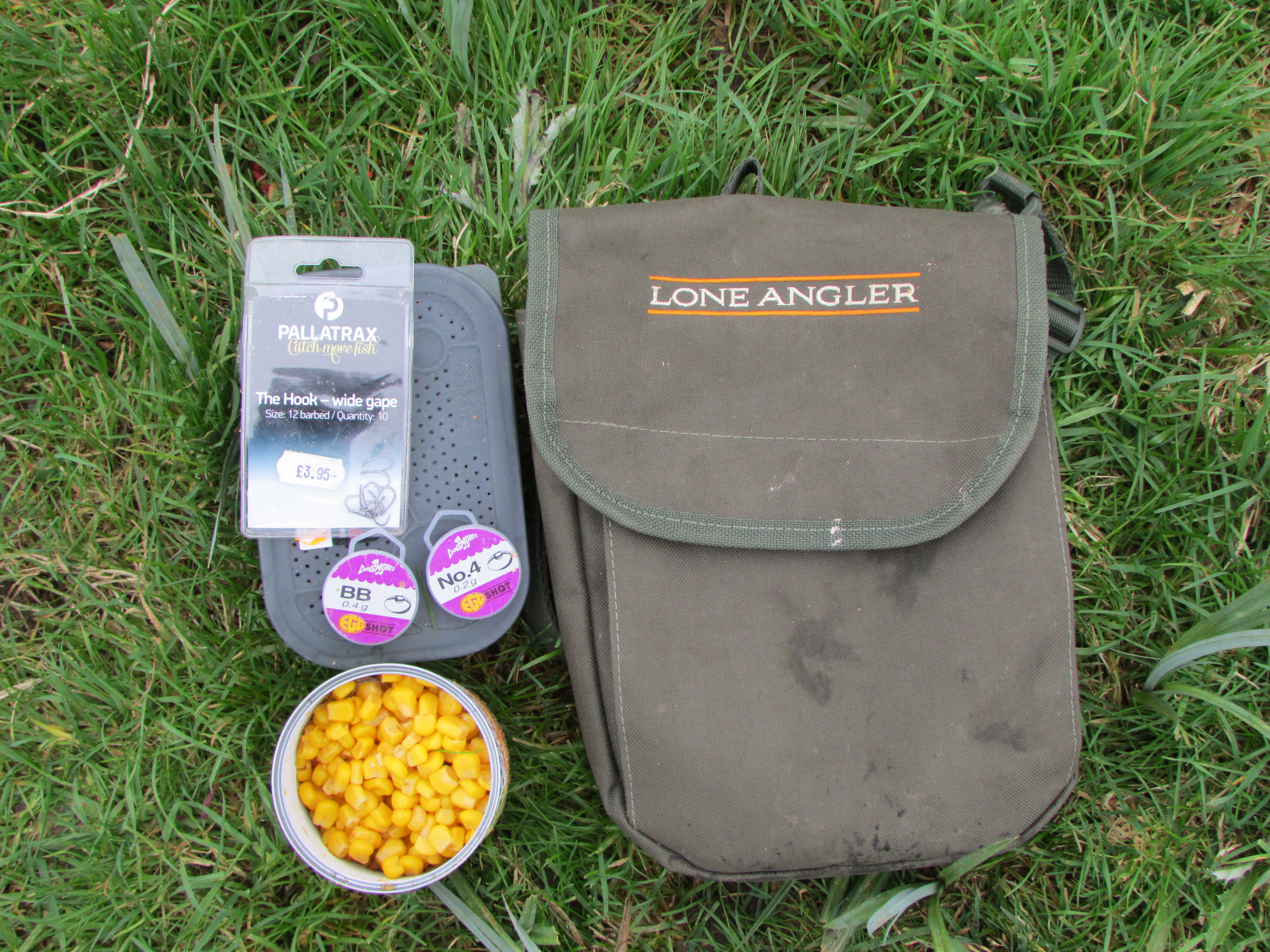 2 pints of maggots, sweetcorn, worms, spare hooks, shot and still room for more in the Lone Angler Bait Pouch.