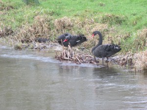 I wandered upstream trying out spots on the way. I spotted a couple of unusual old birds!! Two Antipodean visitors; a pair of black swans. I managed to get a few shots with the camera before spotting them again later in flight. They have the most beautiful white wing feathers which are an incredible contrast to the rest of the bird. Anyway I digress, the odd grayling and trout were tempted but all in all it was difficult. By 3pm the skies were growing very dark with rain clouds and so we opted for an early finish. I ended up with 7 grayling and 3 trout. which put me just ahead of Kevin. Geoff had a tough day and then broke his centrepin! Not the best day for him.