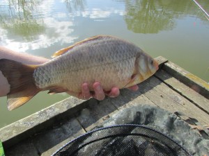 Today was no exception! Some bites were barely discernible. The merest twitch or dip. They were so cautious and so tentative you could easily pass it off as a fish brushing against the line. However a few strikes met with resistance, as a crucian put up a very spirited fight. Often though they signaled either a missed bite or a bumped off fish. I lost around 10 crucians and missed probably 30 bites. I started off with maggots and they produced an almost instant bite. The result was a beautiful golden crucian of around 1.25lbs. After that I couldn’t buy a bite on maggots. I switched to caster; nothing. I switched to small cubes of luncheon meat…nothing. Small green hooker pellets….nothing. Small 6mm white hooker pellets…..bite! It was these small white hookers that they seemed to want and I managed to tempt 11 more crucians before it went dead, around 3pm.