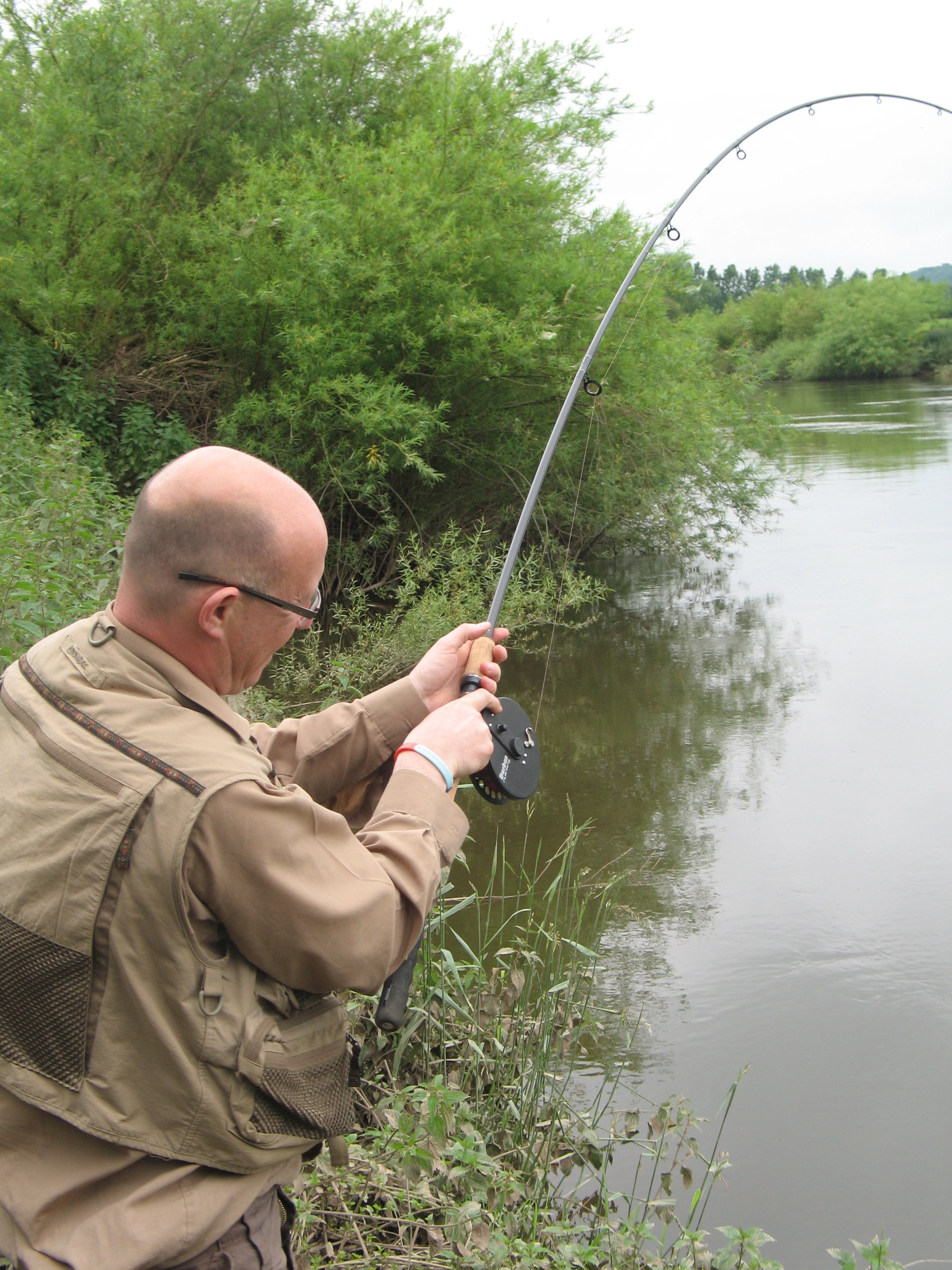A feeder was loaded with bait, two elips glued to the hair and the whole lot cast to the exact spot required. If you get it right, keep hold of the rod, because it won’t take long. A few sharp bangs and the tip rips round….fish on. Soon a nice barbel of around 5-6lbs was recovering in the net. Once unhooked and released it was time for the boys to have a go. It was interesting to note that the barbel here almost pulled you in and when recovering in the net, very nearly pulled that in too. The only difference was the speed of the water and the amount of oxygen this gushing torrent produced and it allowed the barbel a very healthy environment to live in during these extreme temperatures.