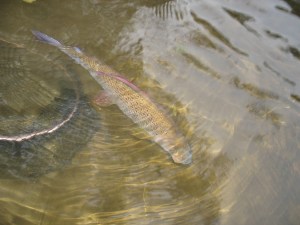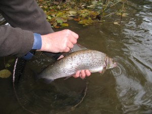 I have to say that after a very short demonstration Peter was soon trotting reasonably well. I left him with some maggots and corn and wandered off to have a dabble myself. The river was a bit higher and more coloured today after quite heavy overnight rain. It didn’t look ideal and judging by the results, it had obviously affected the fishing. I managed to tempt a few grayling from the top of the beat but nothing of any size. I noticed Peter was talking to Geoff, who had wandered upstream and they looked like they had just landed a fish. It turned out to be Peter’s first grayling and a very worthy one too at 1lb 8oz. Not a bad fish for this stretch.