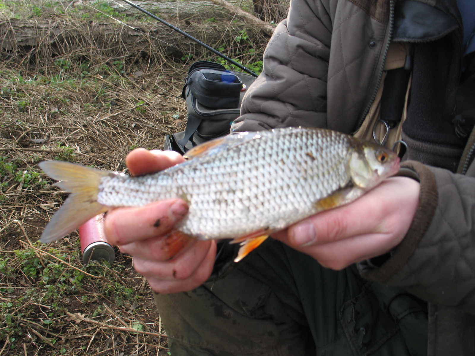 On arrival we found the river fairly coloured and this would particularly suit fishing for the roach. Luckily no one was in the swim I wanted and the stretch down from the weir was also clear, which is where Geoff wanted to fish and another spot where Keith fished with tremendous success, taking countless chub on another day we spent there a season or two back. Tactics were pretty simple; 15ft float rod, centrepin reel with 3lb line and an Avon float finished off with an 18 hook and single red maggot. The swim was deep here, around 8ft and a nice crease veered off to around mid river. It looked very inviting and I felt quite confident. Sadly the wind was blowing a hooley, which made presentation very difficult and me curse a lot! After a nice cuppa I started to fish, keeping the float working along the crease time and time again, always accompanied by a steady trickle of maggots on each and every cast. If there’s one thing you learn whilst watching and talking to Keith, it’s about keeping the feed going in. You have to be methodical in you’re approach to switch the fish on. Sometimes it may take an hour, sometimes 6 hours but more often than not it works.